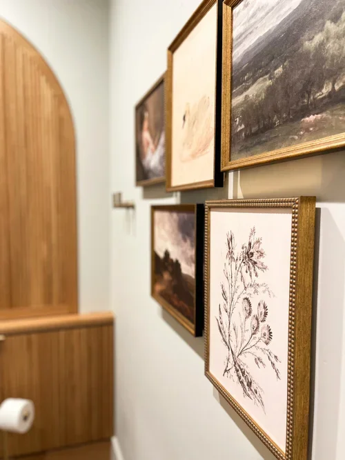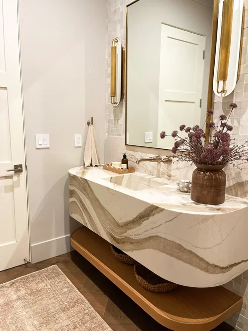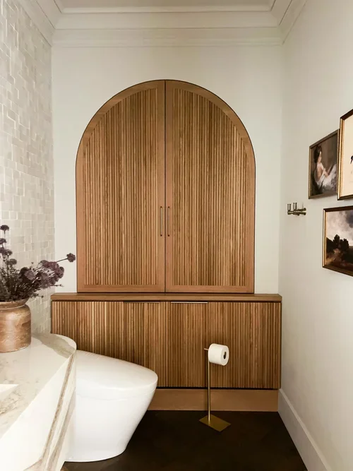 Looking back at some of our favorite transformations, we had to revisit this stunning bathroom remodel—a space where a powder bath feels like a luxe spa. This project was all about the curved bathroom vanity and the arch cabinet in reeded wood.